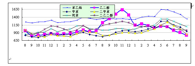 甲苯:受纯苯、原油价格高位回调气氛的影响,9月份现货价格下跌31美元/吨至949美元/吨。