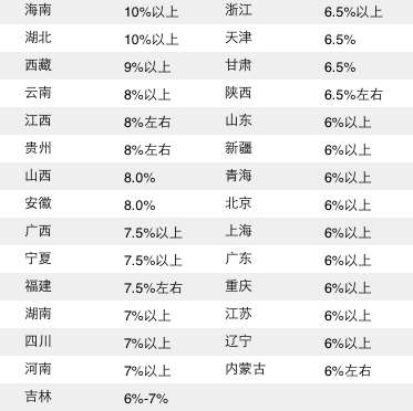 近年来经济增长处于全国领先地位的中西部省份也给出了较高的增速预期。例如,西藏将今年经济增长目标设定在9%以上,云南为8%以上,贵州和江西在8%左右,安徽和山西定在8%。