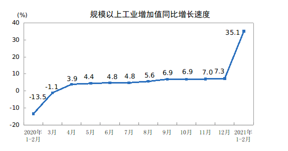 1—2月份,规模以上工业增加值同比实际增长35.1 %(以下增加值增速均为扣除价格因素的实际增长率);比2019年1—2月份增长16.9%,两年平均增长8.1%。从环比看,2月份,规模以上工业增加值比上月增长0.69%。