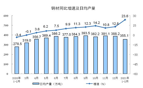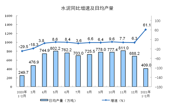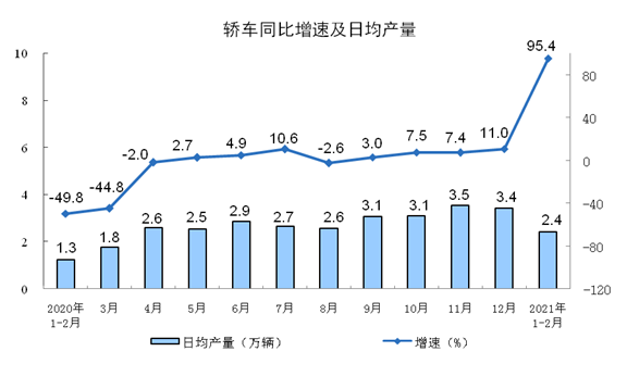 分产品看,1—2月份,612种产品中有565种产品同比增长。钢材20953万吨,同比增长23.6%;水泥24129万吨,增长61.1%;十种有色金属1056万吨,增长10.6%;乙烯475万吨,增长26.7%;汽车385.5万辆,增长89.9%,其中,新能源汽车31.7万辆,增长395.3%;发电量12428亿千瓦时,增长19.5%;原油加工量11424万吨,增长15.0%。