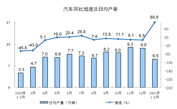 分行业看,1—2月份,41个大类行业中有40个行业增加值保持同比增长。农副食品加工业增长22.8%,纺织业增长39.5%,化学原料和化学制品制造业增长30.8%,非金属矿物制品业增长44.8%,黑色金属冶炼和压延加工业增长21.6%,有色金属冶炼和压延加工业增长22.7%,通用设备制造业增长62.4%,专用设备制造业增长59.2%,汽车制造业增长70.9%,铁路、船舶、航空航天和其他运输设备制造业增长48.9%,电气机械和器材制造业增长69.4%,计算机、通信和其他电子设备制造业增长48.5%,电力、热力生产和供应业增长19.6%。